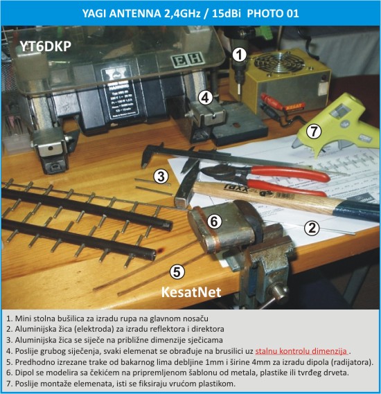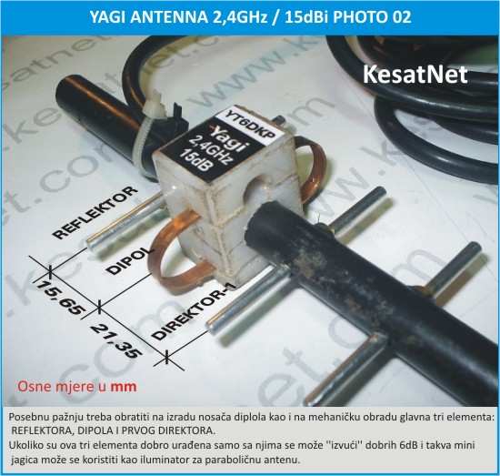 Za ljubitelje WiFI komunikacija u okviru ovog projekta opisana je izrada veoma kvalitetne YAGI antene koja pokriva opseg od 2,4 do 2,485 GHz i daje ”pravih” 15dBi dobiti odnosno pojačanja. Posebno treba naglasiti da antena u cijelom ovom opsegu ima VSWR (Voltage Standing Wave Ratio) manji od 1,5. Izradu ove antene preporučujemo onim konstruktorima koji imaju alat i uslove za finu mehaničku obradu metala i plastike, jer izrada YAGI antene za ovako visoku frekvenciju 2,5GHz je prilično zahtjevan posao. Ipak za one strpljive konstruktore, najveća nagrada će biti kada antenu puste u rad i vide kakve rezultate ona daje.